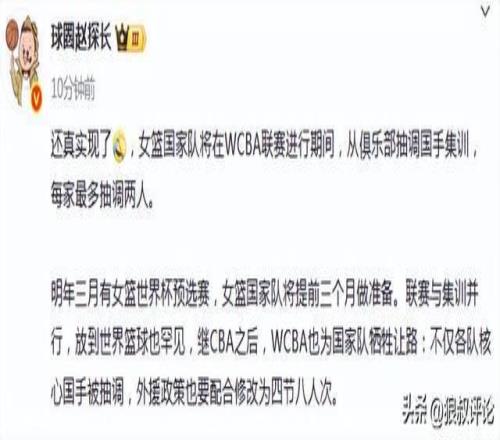 明年三月有女籃世界杯預(yù)選賽,女籃國家隊(duì)將提前三個(gè)月做準(zhǔn)備。聯(lián)賽與集訓(xùn)并行,放到世界籃球也罕見,繼CBA之后,WCBA也為國家隊(duì)犧牲讓路:不僅各隊(duì)核心國手被抽調(diào),外援政策也要配合修改為四節(jié)八人次。