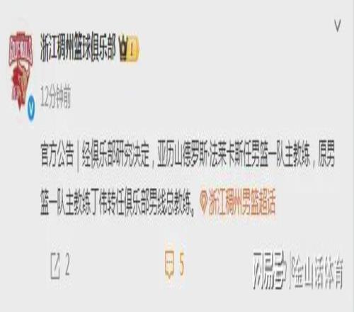 昨天,浙江男籃俱樂(lè)部官方宣布:“經(jīng)俱樂(lè)部研究決定,亞歷山德羅斯·法萊卡斯任男籃一隊(duì)主教練,原男籃一隊(duì)主教練丁偉轉(zhuǎn)任俱樂(lè)部男籃總教練?!?。至此,近日炒得沸沸揚(yáng)揚(yáng)的丁偉“下課”傳聞,正式“靴子落地”。CBA江湖的“救火教練”丁偉,又一次從主教練崗位上下崗。
