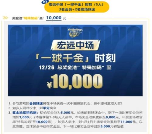 在比賽中場(chǎng)休息的時(shí)候,將會(huì)有五名球迷參加本次活動(dòng),只要球迷在中場(chǎng)投進(jìn)一記超遠(yuǎn)三分球,那么,就直接可以帶走10000元的獎(jiǎng)金。雖然,只有一次機(jī)會(huì),難度系數(shù)很高。然而,籃球是圓的,一切皆有可能。只要您參加,也許,這10000元獎(jiǎng)金就是您的。