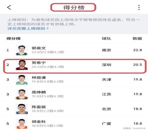 上場時間聯(lián)盟第一,讓我們不妨看看賀希寧的場上數(shù)據(jù)。截止常規(guī)賽前6輪,賀西寧場均得分20.5分,還有5個籃板4.5次助攻進賬。三項數(shù)據(jù)均創(chuàng)造了職業(yè)生涯新高。打青島隊,他砍下24分6籃板2助攻;打吉林隊,他砍下11分5籃板1助攻;打?qū)幉?,他砍?5分3籃板3助攻;打北京隊,他砍下27分5籃板4助攻;打山東隊,他砍下25分3籃板4助攻;打四川隊,他砍下21分8籃板12助攻的準三雙。而賀西寧場均20.5分,也排在本土球員第2位。